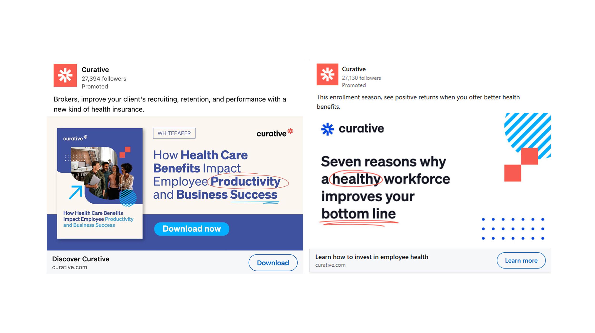 We mapped content promotion to goal, engagement level and deal stage. Upper-funnel lead generation featured educational whitepapers like "How Health Care Benefits Impact Employee Productivity." Retargeting engagement highlighted Curative's differentiators like care navigators. Low-funnel RFP support served conversion-focused content to accounts actively evaluating options.