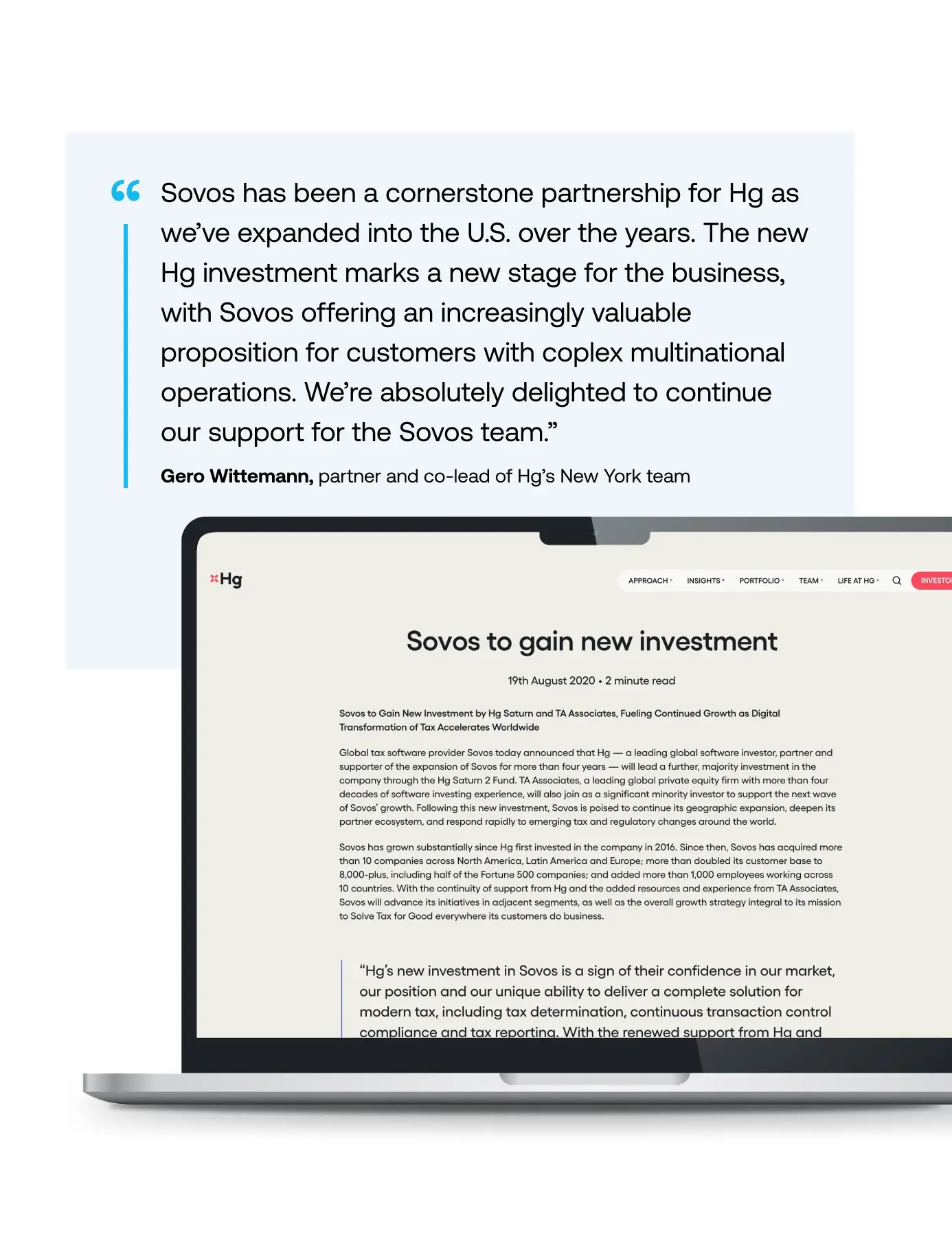 For Sovos’ high volume of acquisitions, Alloy counseled the client on messaging and positioning, timing of internal and external communications and talking points. For every launch, Alloy managed outreach to national business and regional media and handled marketing reports to the executive leadership team and board of directors.